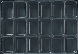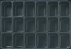332 x 232 x 50 mm, mit eingeklebtem Deckelschaumstoff, Inlett mit 18 Fächern.