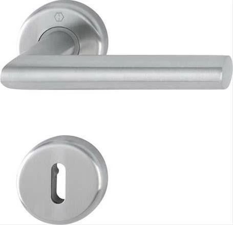 HOPPE-Edelstahl-Innentür-Rosetten-Garnitur (Türgriff-Garnitur): Türgriffe mit HOPPE-Profilstift-Verbindung, Rosetten mit Kunststoff-Unterkonstruktion und Stütznocken, verdeckte, durchgehende Verschraubung mit selbstschneidenden Gewindeschrauben.