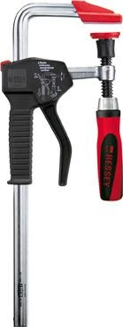 Gleitbügel, Festbügel und Druckplatte aus einem Stück kaltgezogenem Profilstahl, Gleitbügel geschmiedet und galvanisch verzinkt. Gehäuse und Einhand-Spannhebel aus glasfaserverstärktem Polyamid. 2-Komponenten-Kunststoffgriff. Bedienung sowohl über den Griff als auch über die Schienenseite möglich. Gleitbügel mit Schnellverstellung (Tasten-Bedienung). Druckplatte in Führungsbuchse. Mit abnehmbaren Kunststoffkappen an Druckplatte und Oberteil. Auch hervorragend für Überkopfarbeiten geeignet.