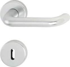 HOPPE-Aluminium-Innentür-Rosetten-Garnitur: geprüft nach DIN EN 1906 (Benutzungs-Kategorie 3), Türgriffe mit HOPPE-Schnellstift-Verbindung (mit HOPPE-Vollstift), Rosetten mit Kunststoff-Unterkonstruktion, Rückholfeder und Stütznocken, verdeckte, durchgehende Verschraubung mit selbstschneidenden Gewindeschrauben.
