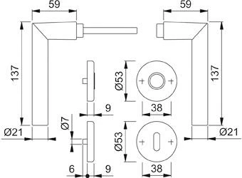 HOPPE-Aluminium-Innentür-Rosetten-Garnitur: geprüft nach DIN EN 1906 (Benutzungs-Kategorie 3), Türgriffe mit HOPPE-Schnellstift-Verbindung (mit HOPPE-Vollstift), Rosetten mit Kunststoff-Unterkonstruktion, Rückholfeder und Stütznocken, verdeckte, durchgehende Verschraubung mit selbstschneidenden Gewindeschrauben.