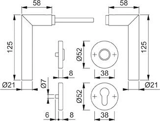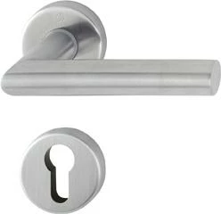 HOPPE-Edelstahl-Innentür-Rosetten-Garnitur: geprüft nach DIN EN 1906 (Benutzungs-Kategorie 3), Türgriffe mit HOPPE-Schnellstift-Verbindung (mit HOPPE-Vollstift), Rosetten mit Kunststoff-Unterkonstruktion, Rückholfeder und Stütznocken, verdeckte, durchgehende Verschraubung mit selbstschneidenden Gewindeschrauben.