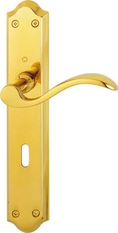 HOPPE-Messing-Innentür-Langschild-Garnitur (Türgriff-Garnitur): Türgriffe fest/drehbar gelagert (mit Rückholfeder), mit HOPPE-Profilstift-Verbindung, Schilder sichtbar verschraubt.