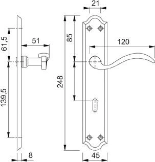 HOPPE-Messing-Innentür-Langschild-Garnitur (Türgriff-Garnitur): Türgriffe fest/drehbar gelagert (mit Rückholfeder), mit HOPPE-Profilstift-Verbindung, Schilder sichtbar verschraubt.