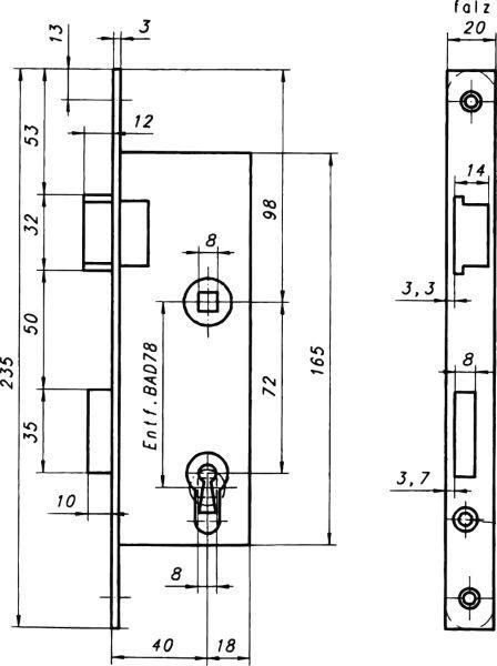 Für gefälzte Türen, 1-tourig, Entfernung: 72 mm, Nuss: 8 mm, Falle und Riegel aus Metall (Zinkdruckguss), mit Wechsel. Stulp: 20 mm, käntig, silberfarbig lackiert, PZ.