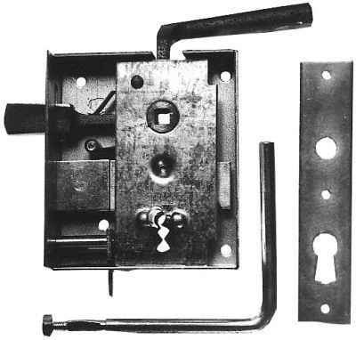 Innen mit festem Drücker, außen mit losem Drücker und Langschild, einwärts mit Einschlagkloben, auswärts mit Seitwärtskloben, verzinkt mit einem Schlüssel. BB.