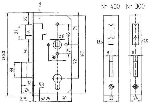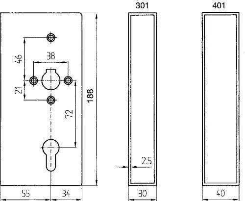 Mit Wechsel, für Rundrohr 19,05 mm Ø (3/4″), für Vierkantrohr 30 mm, Falle umlegbar (rechts und links verwendbar), Falle bündig, Höhe 188 mm, Breite 89 mm, Nuss 8 mm, Dornmaß 55 mm, Entfernung 72 mm, Schloss Eisen verzinkt, Schlossgehäuse Stahl blank.
