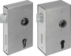 Schlossklasten mit verzinktem Schloss, rechts und links verwendbar, vorgerichtet für Profilzylinder, mit Wechsel, inklusive 2 Drückerrosetten 18 mm.