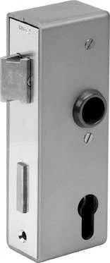 Schlosskasten, schmal, zum Anschweißen, mit verzinktem Schloss, rechts und links verwendbar, vorgerichtet für Profilzylinder, mit Wechsel, inklusive 2 Drückerrosetten 18 mm.