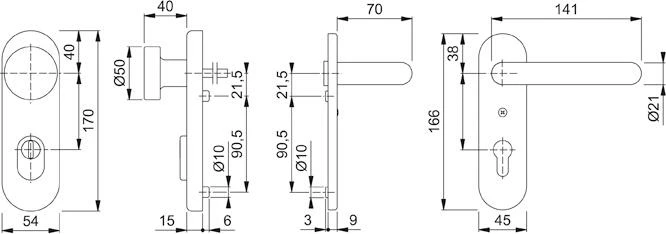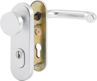 HOPPE-Aluminium-Feuerschutz-Schutzbeschlag ES1 (SK2), geprüft nach DIN 18257, DIN 18273 und mitgeprüft in Notausgangsverschlüssen nach DIN EN 179, Stahl-Unterkonstruktion im Außen- und Innenschild; außen: feststehender Knopf, Zylinder-Abdeckung aus gehärtetem Stahl für vorstehende Zylinderlänge 10-18 mm; innen: Türgriff fest/drehbar gelagert im wartungsfreien Gleitlager der Stahl-Unterkonstruktion, 9 mm HOPPE-FDW-Profilvollstift-Verbindung mit Klemmfeder zum Toleranzausgleich in der Schlossnuss, hochfeste, sichtbare Verschraubung.