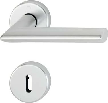 HOPPE-Aluminium-Innentür-Rosetten-Garnitur: geprüft nach DIN EN 1906 (Benutzungs-Kategorie 3), Türgriffe mit HOPPE-Schnellstift-Verbindung (mit HOPPE-Vollstift), Rosetten mit Kunststoff-Unterkonstruktion, Rückholfeder und Stütznocken, verdeckte, durchgehende Verschraubung mit selbstschneidenden Gewindeschrauben.